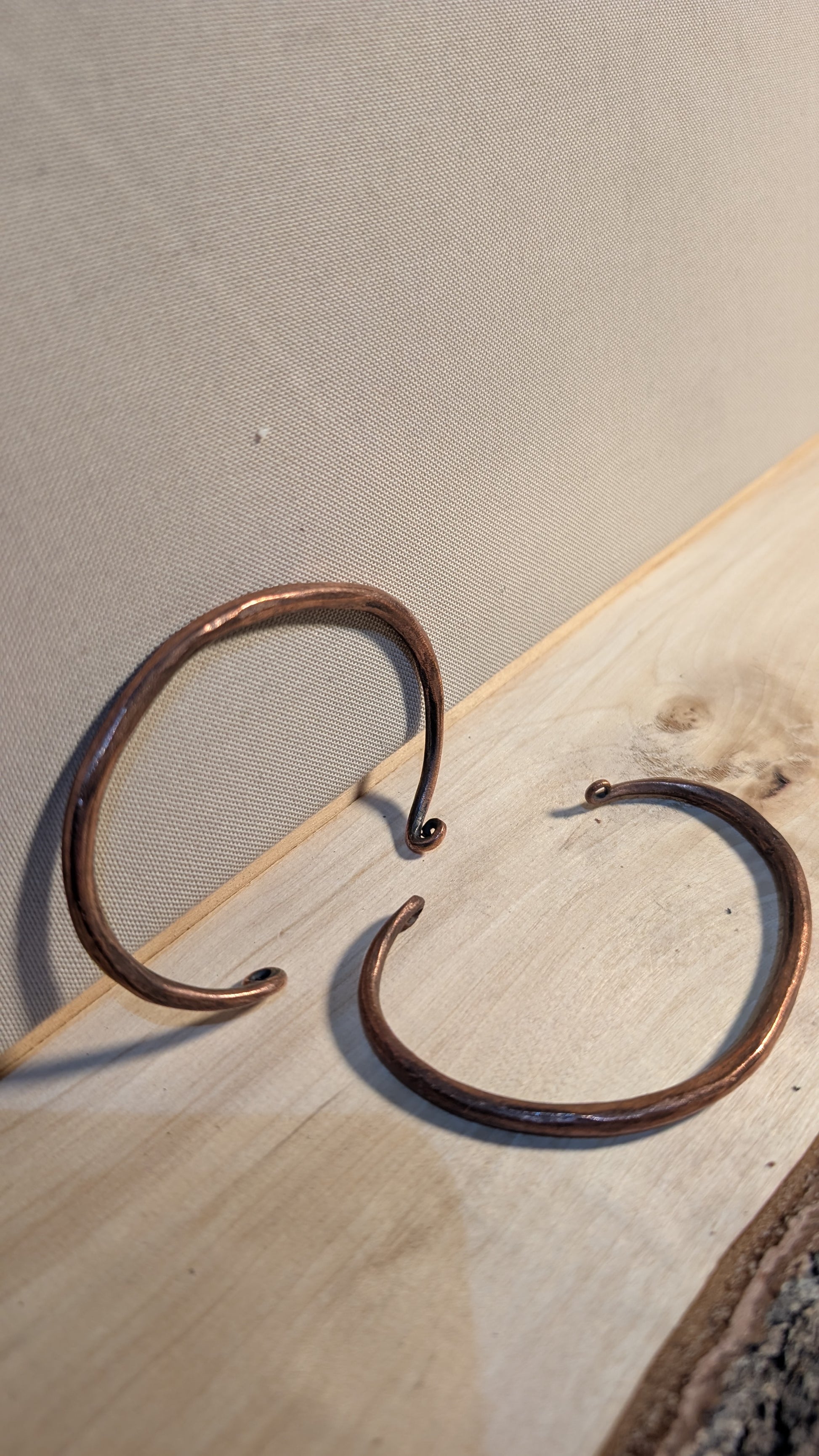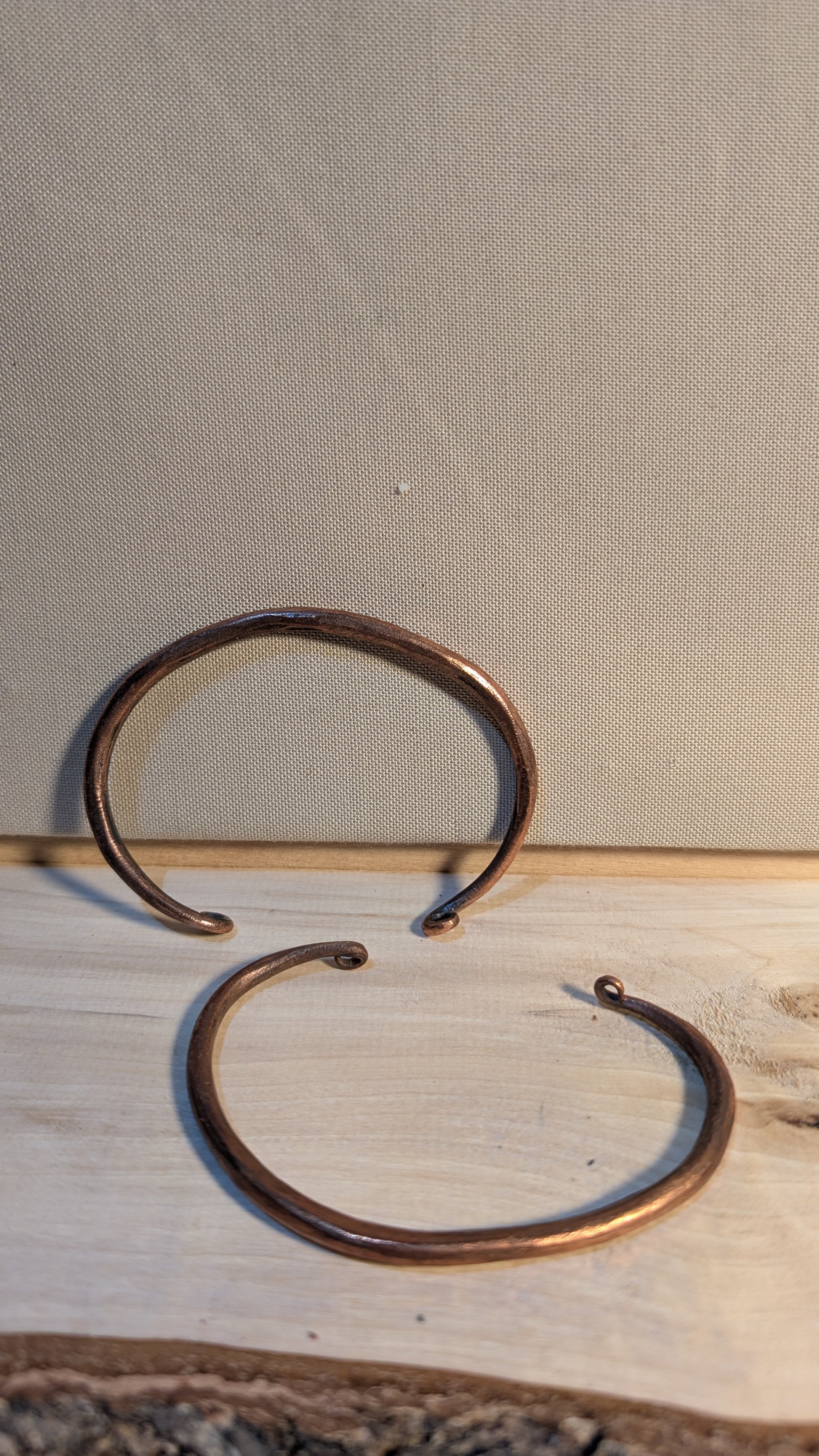 Elegant armbånd i tynt kobber, håndsmidt fra tykkere metall med raffinert finish. Åpent design på cirka 7 cm x 5 cm og tykkelse 4mm. Det myke kobberet tillater liten justering for perfekt passform rundt håndleddet. Et tidløst håndverksstykke som kombinerer tradisjonell smedkunst med diskret skjønnhet.